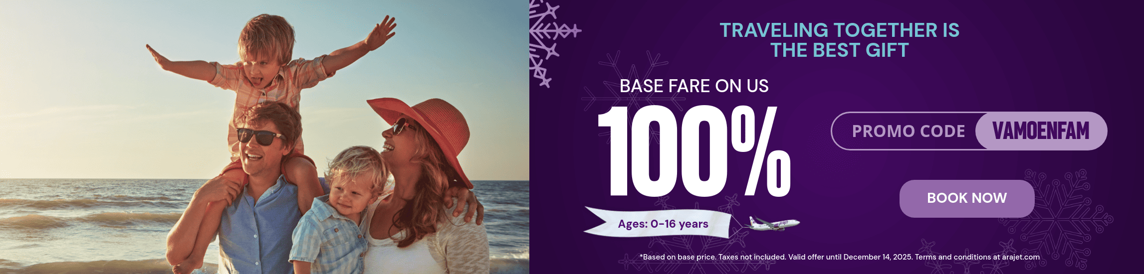 With the promo code VAMOENFAM, kids and infants fly FOR FREE (100% OFF on base fare, taxes not included) so you can finally enjoy that long-awaited trip to any of our destinations from the moment you book.