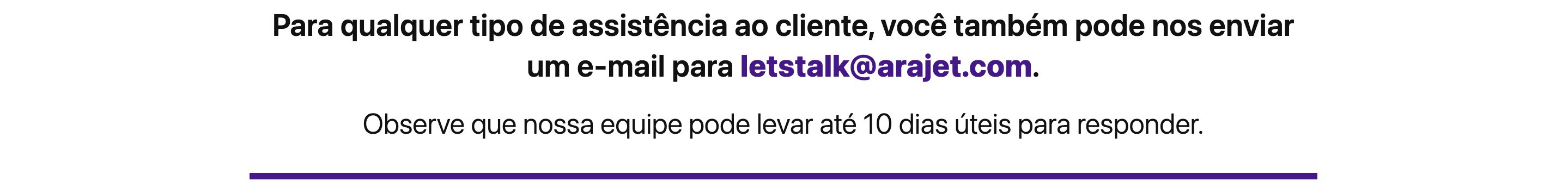 Na Arajet, nosso objetivo é tornar sua experiência de viagem a mais tranquila possível. Para respostas rápidas, utilize nosso Centro de Ajuda. Se precisar de assistência adicional, entre em contato conosco por e-mail, chat ou pelos números abaixo. Nossas centrais de atendimento estão disponíveis 24 horas por dia, 7 dias por semana, em espanhol e inglês. O suporte em português está disponível por voz das 8h00 às 00h00 (meia-noite, horário local de São Paulo), e por chat 24 horas por dia, 7 dias por semana.